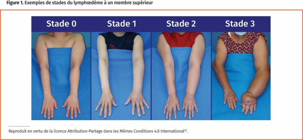On distingue 4 stades de lymphodème. Les personnes atteintes peuvent présenter plusieurs symptômes caractéristiques :